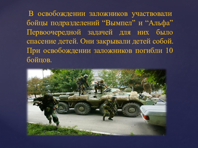 Слайд 10 В освобождении заложников участвовали бойцы подразделений “Вымпел” и “Альфа” Первоочередной задачей