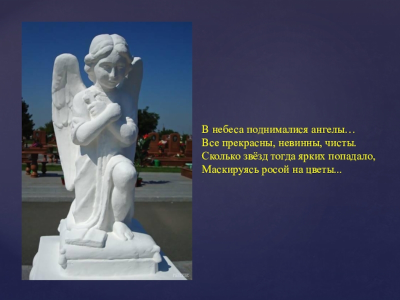Слайд 12В небеса поднималися ангелы… Все прекрасны, невинны, чисты. Сколько звёзд тогда ярких попадало, Маскируясь