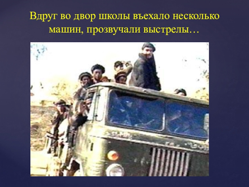 Слайд 6Вдруг во двор школы въехало несколько машин, прозвучали выстрелы…