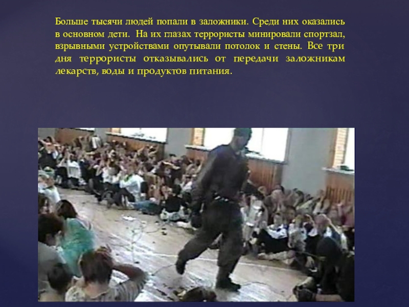 дети.  На их глазах террористы минировали спортзал, взрывными устройствами опутывали потолок и стены. Все три дня террористы отказывались от передачи заложникам лекарств, воды и продуктов питания.