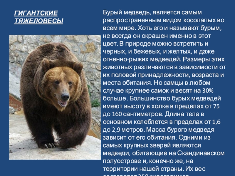 во всем мире. Хоть его и называют бурым, не всегда он окрашен именно в этот цвет. В природе можно встретить и черных, и бежевых, и желтых, и даже огненно-рыжих медведей. Размеры этих животных различаются в зависимости от их половой принадлежности, возраста и места обитания. Но самцы в любом случае крупнее самок и весят на 30% больше. Большинство бурых медведей имеют высоту в холке в пределах от 75 до 160 сантиметров. Длина тела в основном колеблется в пределах от 1,6 до 2,9 метров. Масса бурого медведя зависит от его обитания. Одними из самых крупных зверей являются медведи, обитающие на Скандинавском полуострове и, конечно же, на территории нашей страны. Их вес составляет 350 килограммов.