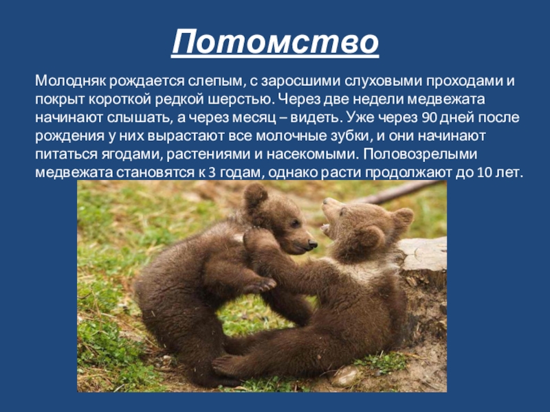 шерстью. Через две недели медвежата начинают слышать, а через месяц – видеть. Уже через 90 дней после рождения у них вырастают все молочные зубки, и они начинают питаться ягодами, растениями и насекомыми. Половозрелыми медвежата становятся к 3 годам, однако расти продолжают до 10 лет.