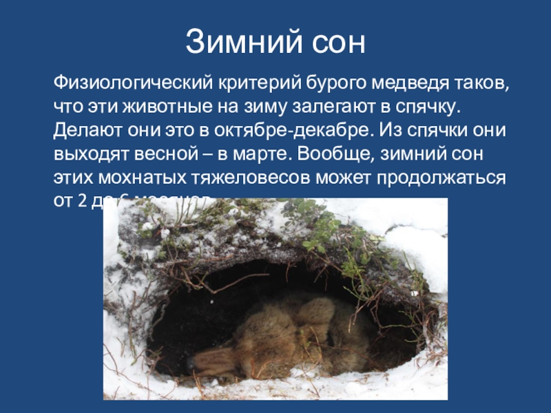 на зиму залегают в спячку. Делают они это в октябре-декабре. Из спячки они выходят весной – в марте. Вообще, зимний сон этих мохнатых тяжеловесов может продолжаться от 2 до 6 месяцев.