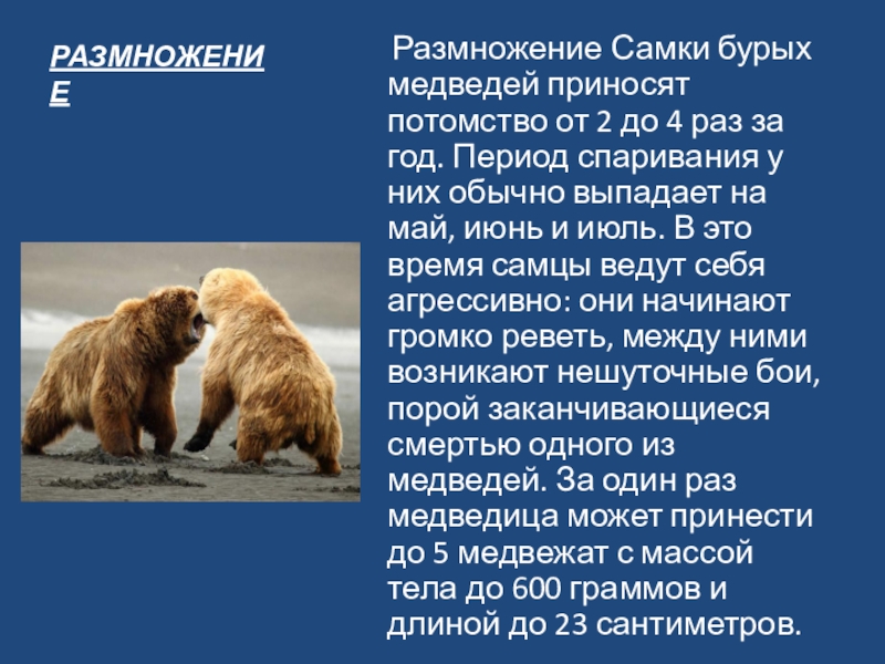 до 4 раз за год. Период спаривания у них обычно выпадает на май, июнь и июль. В это время самцы ведут себя агрессивно: они начинают громко реветь, между ними возникают нешуточные бои, порой заканчивающиеся смертью одного из медведей. За один раз медведица может принести до 5 медвежат с массой тела до 600 граммов и длиной до 23 сантиметров.