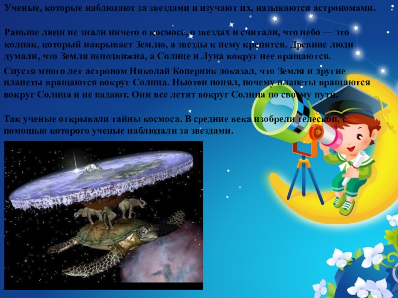 Так ученые открывали тайны космоса. В средние века изобрели телескоп, с помощью которого ученые наблюдали за звездами.