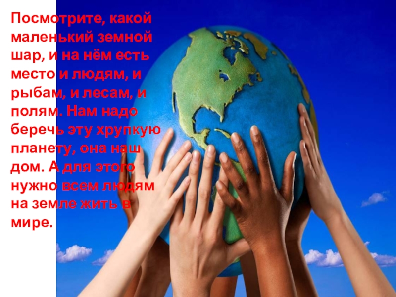 людям, и рыбам, и лесам, и полям. Нам надо беречь эту хрупкую планету, она наш дом. А для этого нужно всем людям на земле жить в мире.