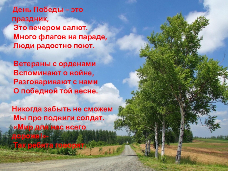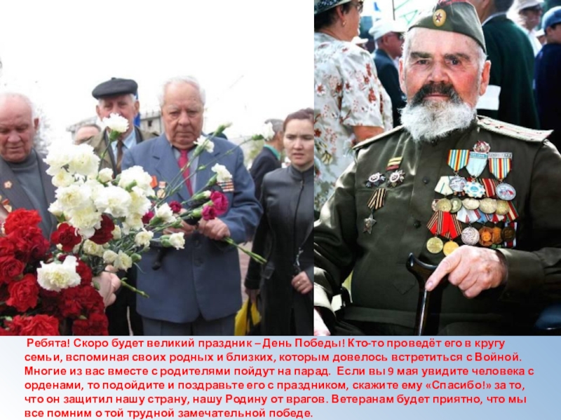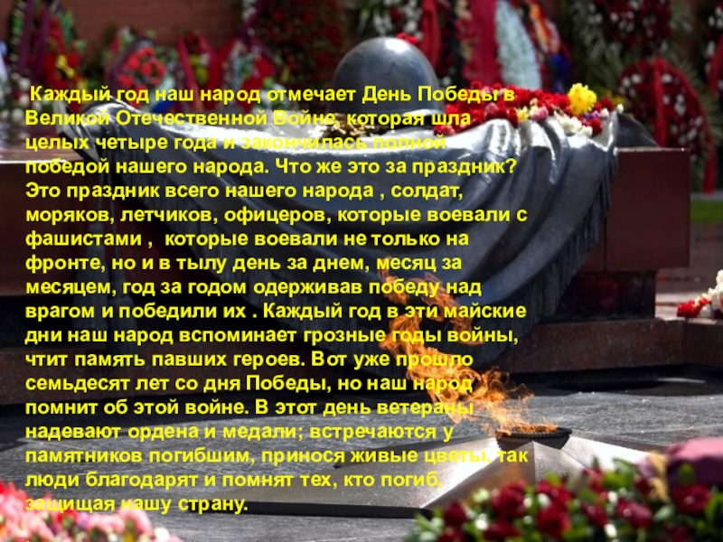 наш народ отмечает День Победы в Великой Отечественной Войне, которая шла целых четыре года и закончилась полной победой нашего народа. Что же это за праздник? Это праздник всего нашего народа , солдат, моряков, летчиков, офицеров, которые воевали с фашистами , которые воевали не только на фронте, но и в тылу день за днем, месяц за месяцем, год за годом одерживав победу над врагом и победили их . Каждый год в эти майские дни наш народ вспоминает грозные годы войны, чтит память павших героев. Вот уже прошло семьдесят лет со дня Победы, но наш народ помнит об этой войне. В этот день ветераны надевают ордена и медали; встречаются у памятников погибшим, принося живые цветы, так люди благодарят и помнят тех, кто погиб, защищая нашу страну.