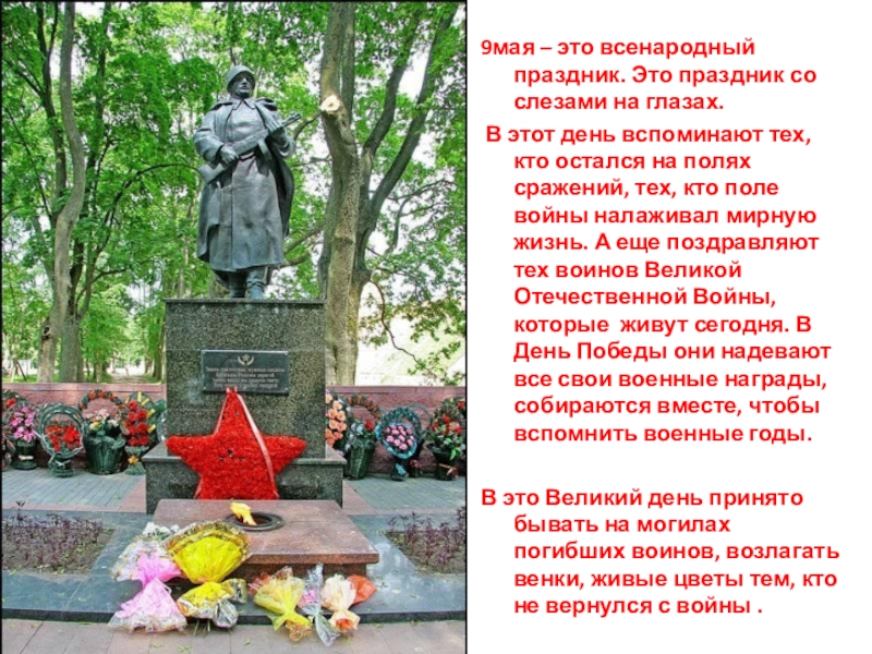 Слайд 189мая – это всенародный праздник. Это праздник со слезами на глазах.