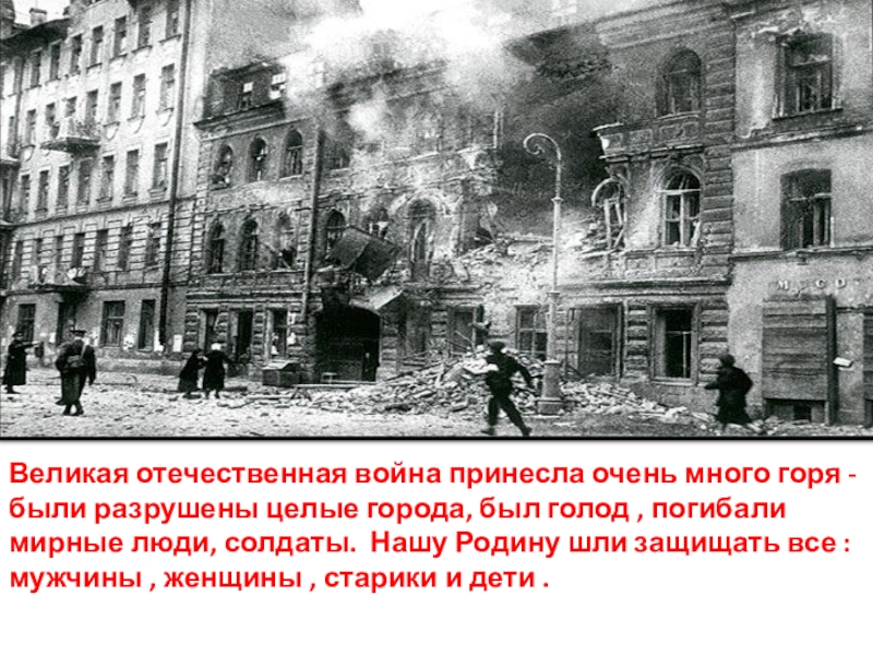 города, был голод , погибали мирные люди, солдаты. Нашу Родину шли защищать все : мужчины , женщины , старики и дети .