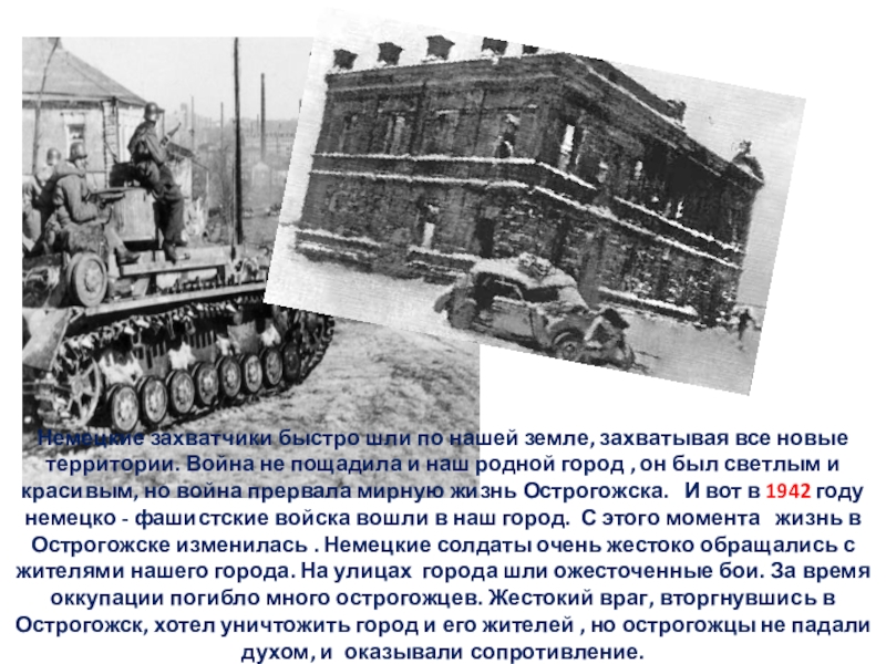 Война не пощадила и наш родной город , он был светлым и красивым, но война прервала мирную жизнь Острогожска. И вот в 1942 году немецко - фашистские войска вошли в наш город. С этого момента жизнь в Острогожске изменилась . Немецкие солдаты очень жестоко обращались с жителями нашего города. На улицах города шли ожесточенные бои. За время оккупации погибло много острогожцев. Жестокий враг, вторгнувшись в Острогожск, хотел уничтожить город и его жителей , но острогожцы не падали духом, и оказывали сопротивление.