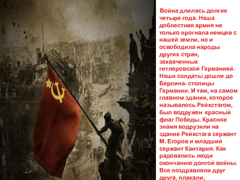 армия не только прогнала немцев с нашей земли, но и освободила народы других стран, захваченных гитлеровской Германией. Наши солдаты дошли до Берлина- столицы Германии. И там, на самом главном здании, которое называлось Рейхстагом, был водружен красный флаг Победы. Красное знамя водрузили на здание Рейхстага сержант М. Егоров и младший сержант Кантария. Как радовались люди окончанию долгой войны. Все поздравляли друг друга, плакали, вспоминая погибших, в ночном небе вспыхнули огоньки праздничного салюта.