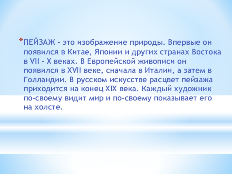 и других странах Востока в VII – X веках. В Европейской живописи он появился в XVII веке, сначала в Италии, а затем в Голландии. В русском искусстве расцвет пейзажа приходится на конец XIX века. Каждый художник по-своему видит мир и по-своему показывает его на холсте.