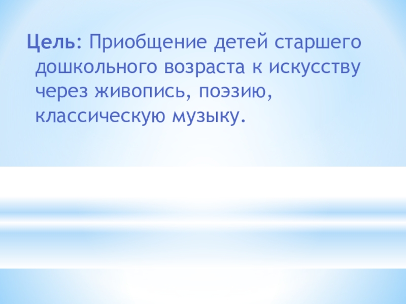 Слайд 2Цель: Приобщение детей старшего дошкольного возраста к искусству через живопись, поэзию,