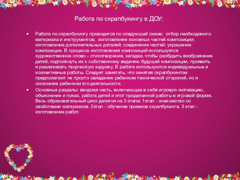 Основные разделы: вводная часть, включающая в себя игровую мотивацию, объяснение и показ, работа детей и итог проделанной работы в игровой форме. Весь образовательный цикл делится на 3 этапа: 1этап - знакомство со свойствами материалов. 2этап - обучение приемов скрапбукинга. 3 этап - изготовление работ.