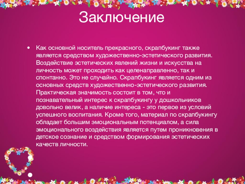эстетических явлений жизни и искусства на личность может проходить как целенаправленно, так и спонтанно. Это не случайно. Скрапбукинг является одним из основных средств художественно-эстетического развития. Практическая значимость состоит в том, что и познавательный интерес к скрапбукингу у дошкольников довольно велик, а наличие интереса - это первое из условий успешного воспитания. Кроме того, материал по скрапбукингу обладает большим эмоциональным потенциалом, а сила эмоционального воздействия является путем проникновения в детское сознание и средством формирования эстетических качеств личности.