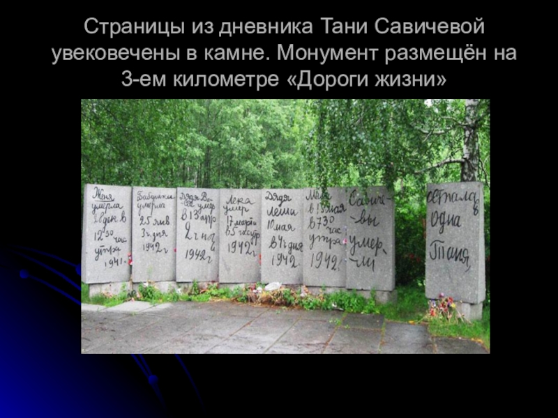 Слайд 19Страницы из дневника Тани Савичевой увековечены в камне. Монумент размещён на