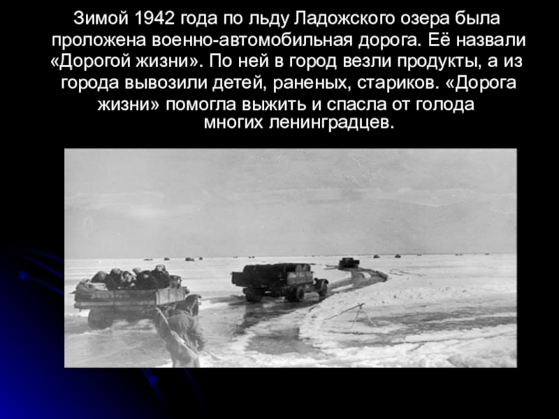 Слайд 13 Зимой 1942 года по льду Ладожского озера была