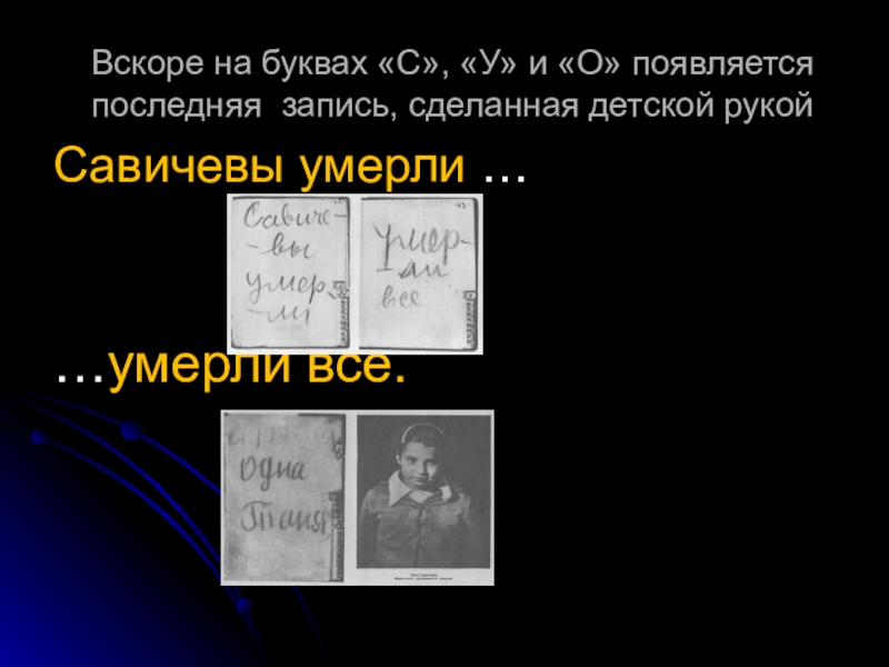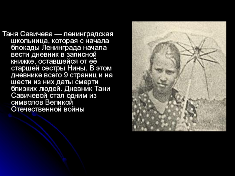вести дневник в записной книжке, оставшейся от её старшей сестры Нины. В этом дневнике всего 9 страниц и на шести из них даты смерти близких людей. Дневник Тани Савичевой стал одним из символов Великой Отечественной войны