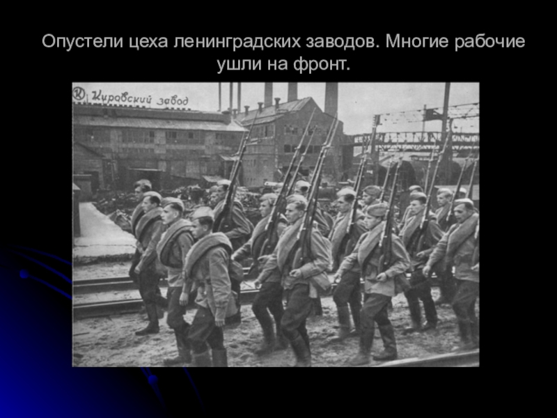 Слайд 5Опустели цеха ленинградских заводов. Многие рабочие ушли на фронт.