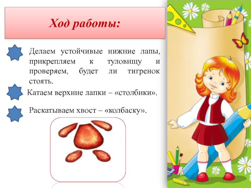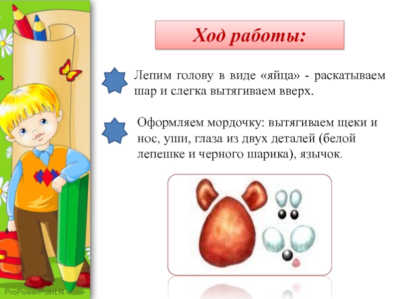 Оформляем мордочку: вытягиваем щеки и нос, уши, глаза из двух деталей (белой лепешке и черного шарика), язычок.