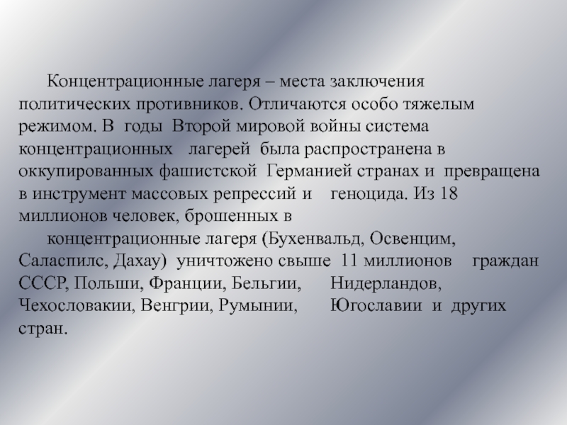 концентрационные лагеря (Бухенвальд, Освенцим, Саласпилс, Дахау) уничтожено свыше 11 миллионов граждан СССР, Польши, Франции, Бельгии, Нидерландов, Чехословакии, Венгрии, Румынии, Югославии и других стран.