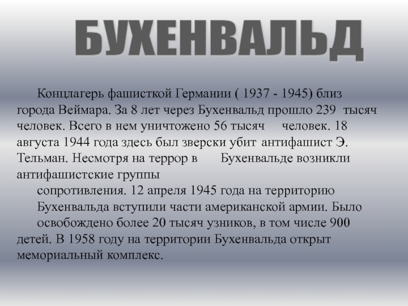 За 8 лет через Бухенвальд прошло 239 тысяч человек. Всего в нем уничтожено 56 тысяч человек. 18 августа 1944 года здесь был зверски убит антифашист Э. Тельман. Несмотря на террор в Бухенвальде возникли антифашистские группы
