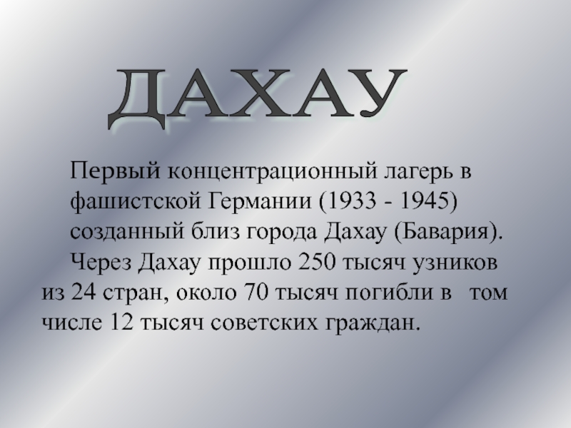 Через Дахау прошло 250 тысяч узников из 24 стран, около 70 тысяч погибли в том числе 12 тысяч советских граждан.