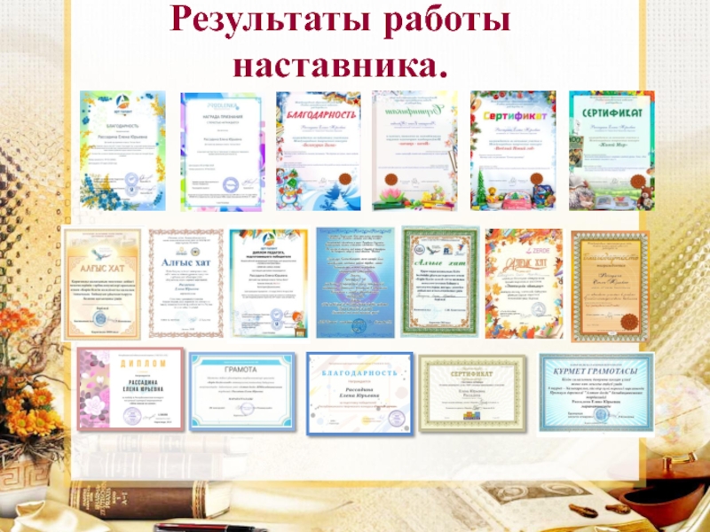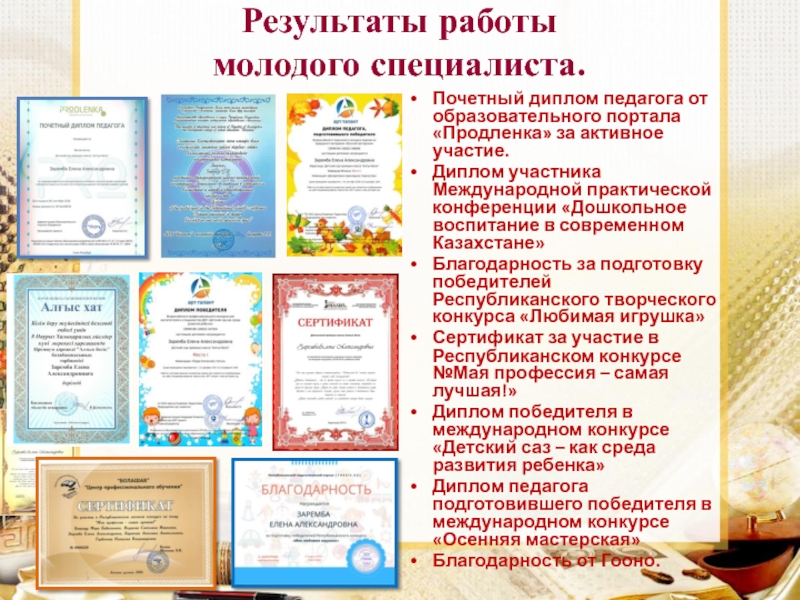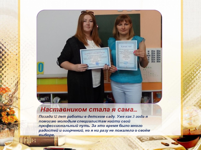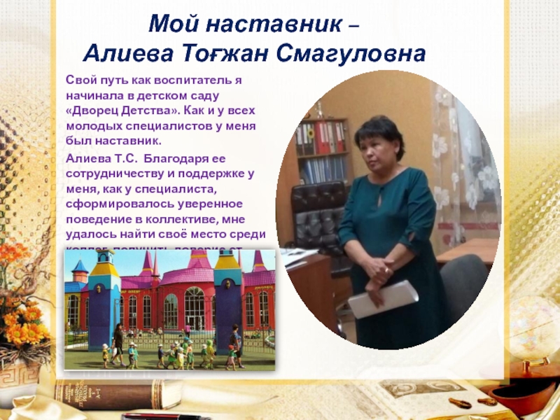 Алиева Т.С. Благодаря ее сотрудничеству и поддержке у меня, как у специалиста, сформировалось уверенное поведение в коллективе, мне удалось найти своё место среди коллег, получить доверие от родителей и детей.