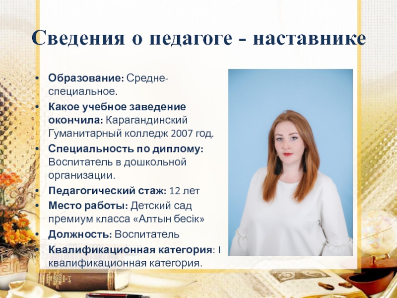 Специальность по диплому: Воспитатель в дошкольной организации.