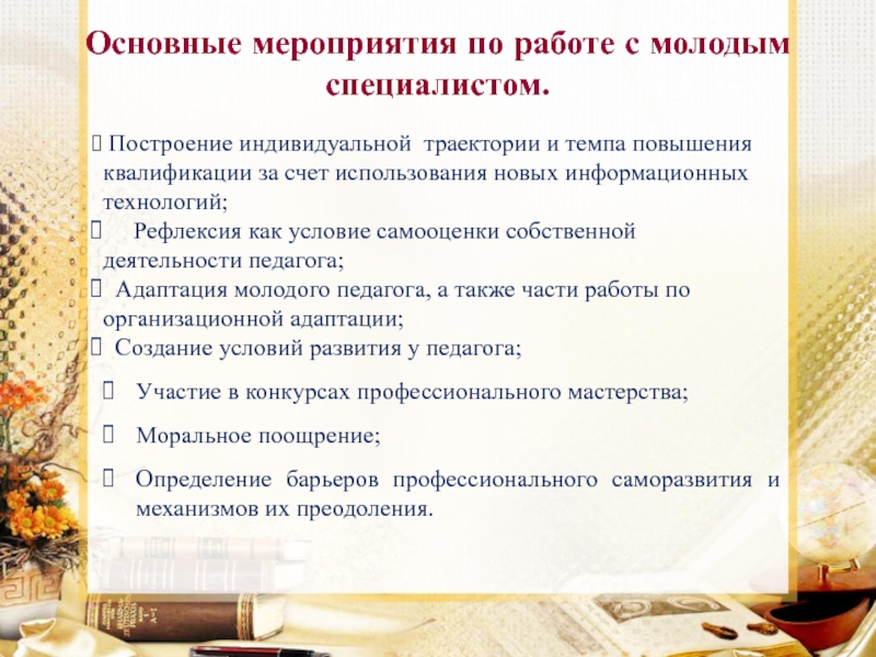 Адаптация молодого педагога, а также части работы по организационной адаптации;