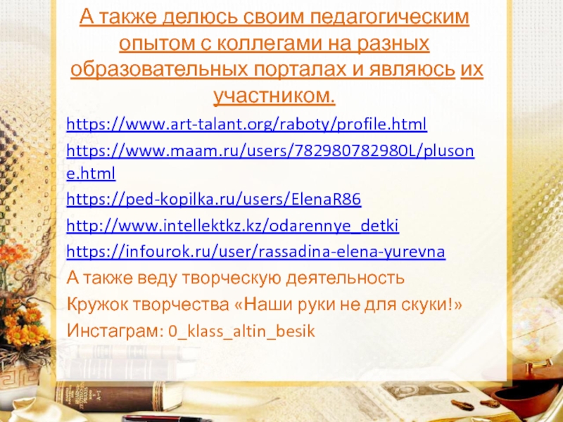 Слайд 11А также делюсь своим педагогическим опытом с коллегами на разных образовательных