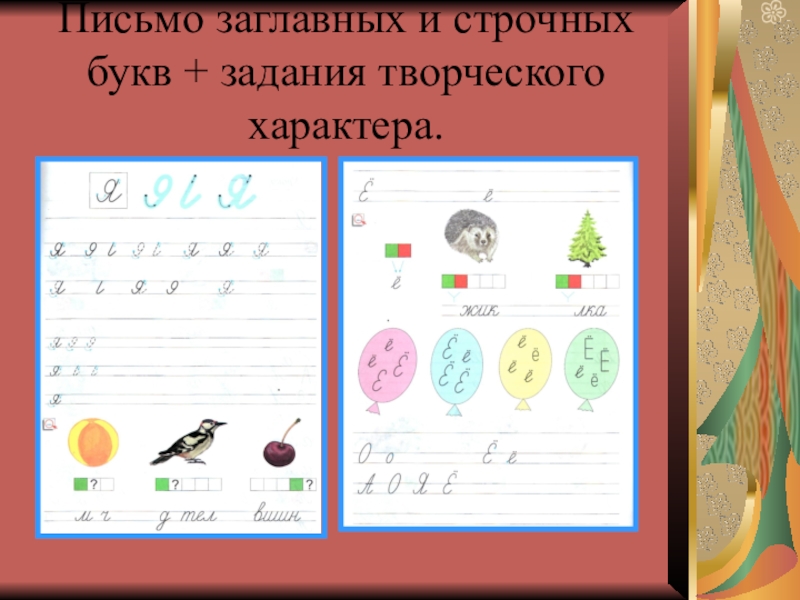 Слайд 26Письмо заглавных и строчных букв + задания творческого характера.