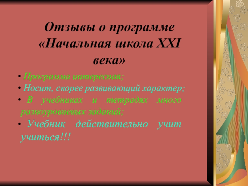Слайд 29Отзывы о программе «Начальная школа XXI века»