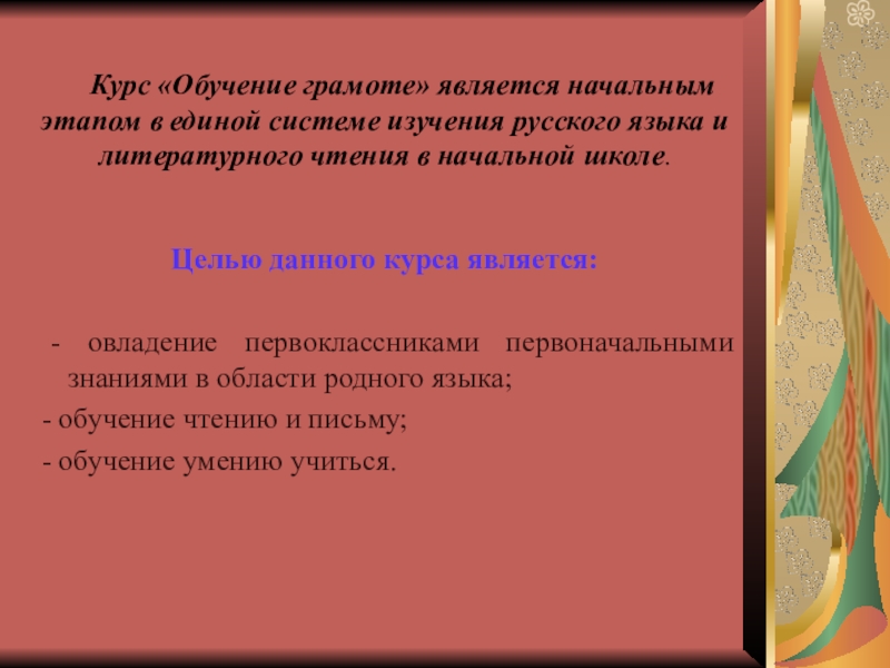 Слайд 10 Курс «Обучение грамоте» является начальным этапом в единой системе
