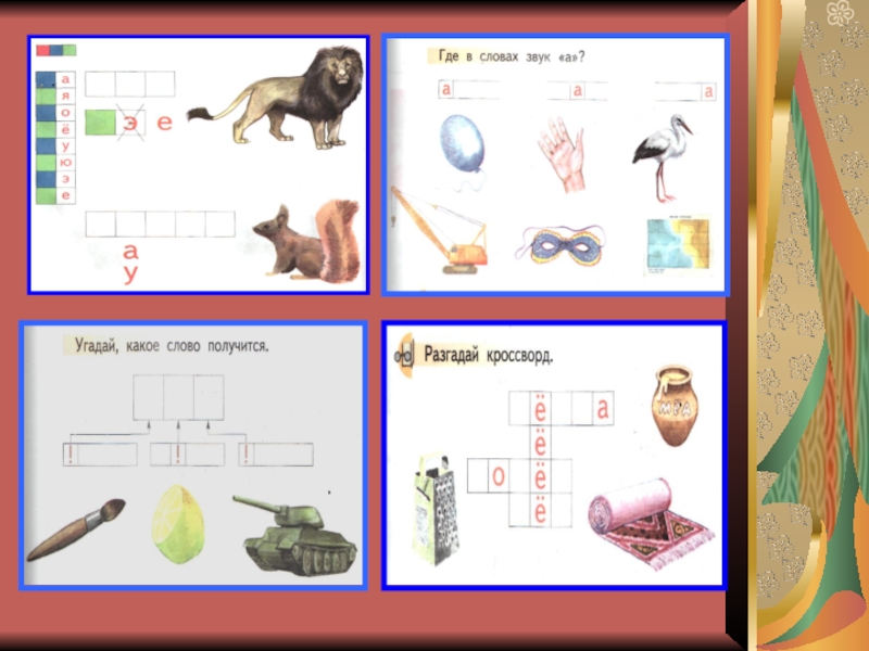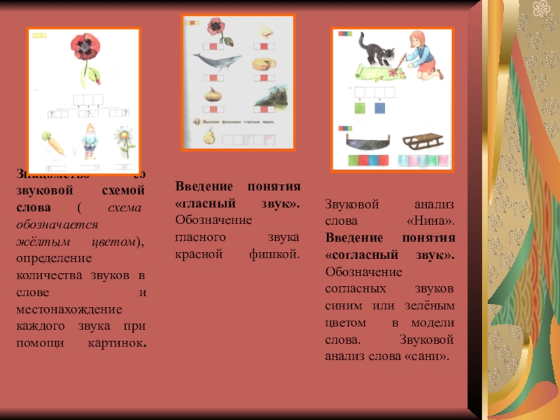 количества звуков в слове и местонахождение каждого звука при помощи картинок.