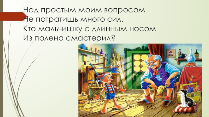 Над простым моим вопросом Не потратишь много сил. Кто мальчишку с длинным носом Из полена смастерил?