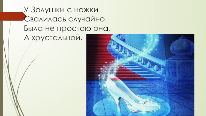 У Золушки с ножки Свалилась случайно. Была не простою она, А хрустальной.