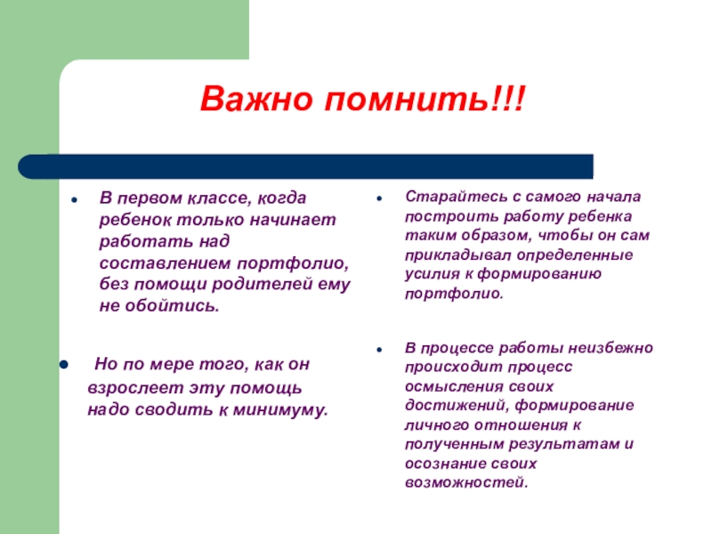 Старайтесь с самого начала построить работу ребенка таким образом, чтобы он сам прикладывал определенные усилия к формированию портфолио.