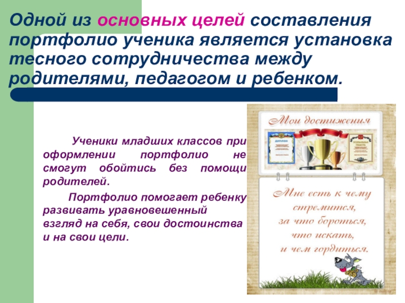 Портфолио помогает ребенку развивать уравновешенный взгляд на себя, свои достоинства и на свои цели.