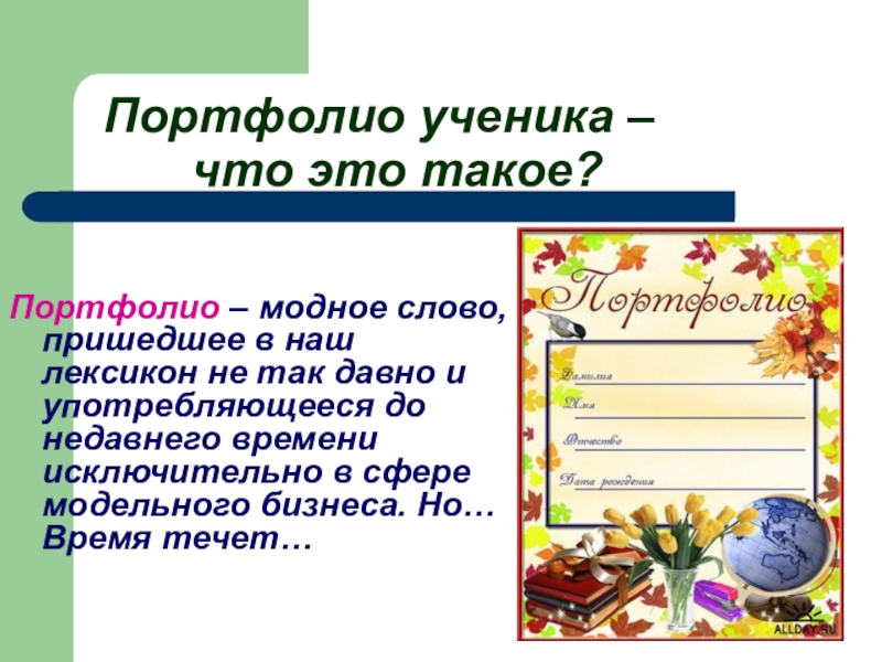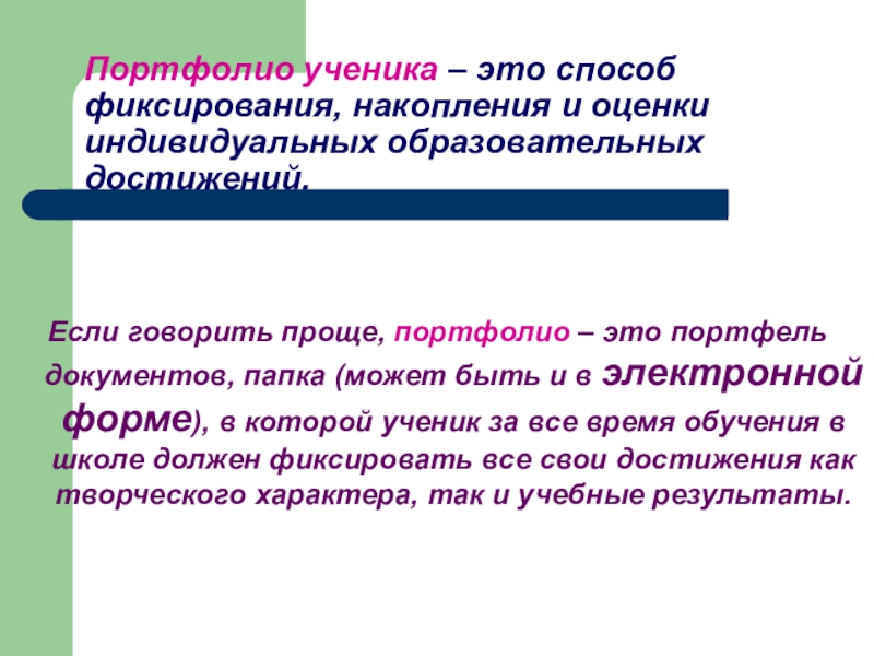 Если говорить проще, портфолио – это портфель документов, папка (может быть и в электронной форме), в которой ученик за все время обучения в школе должен фиксировать все свои достижения как творческого характера, так и учебные результаты.
