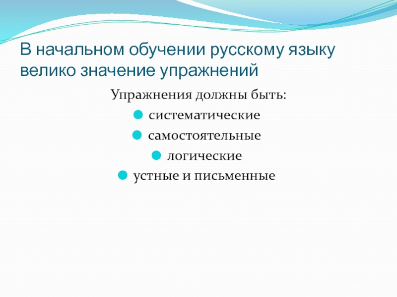 Слайд 12В начальном обучении русскому языку велико значение упражнений