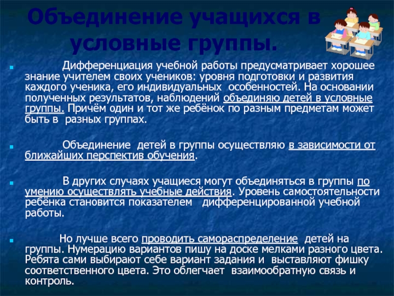 Слайд 5Объединение учащихся в условные группы.