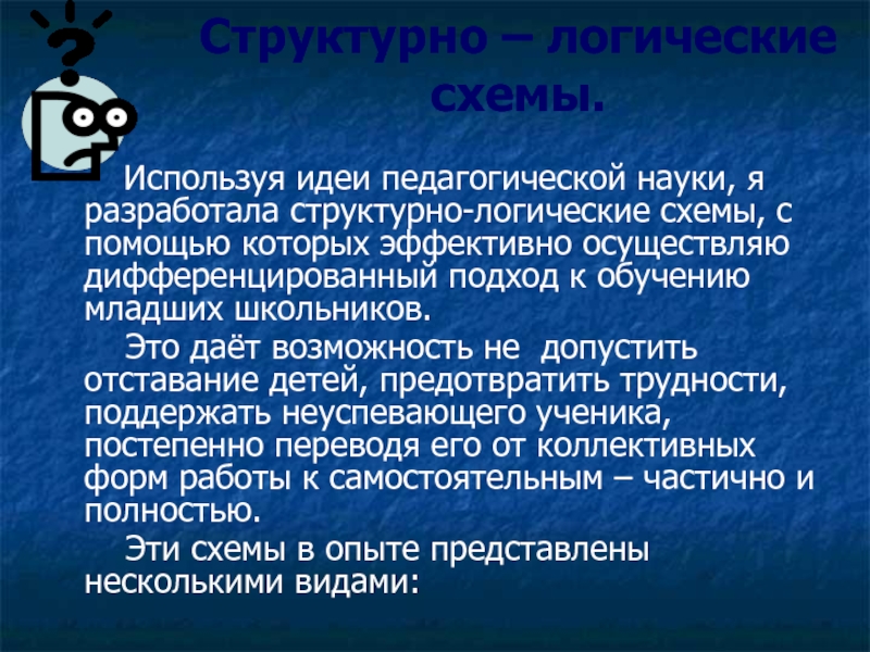 науки, я разработала структурно-логические схемы, с помощью которых эффективно осуществляю дифференцированный подход к обучению младших школьников.