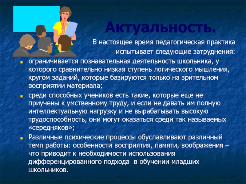 Различные психические процессы обуславливают различный темп работы: особенности восприятия, памяти, воображения – что приводит к необходимости использования дифференцированного подхода в обучении младших школьников.