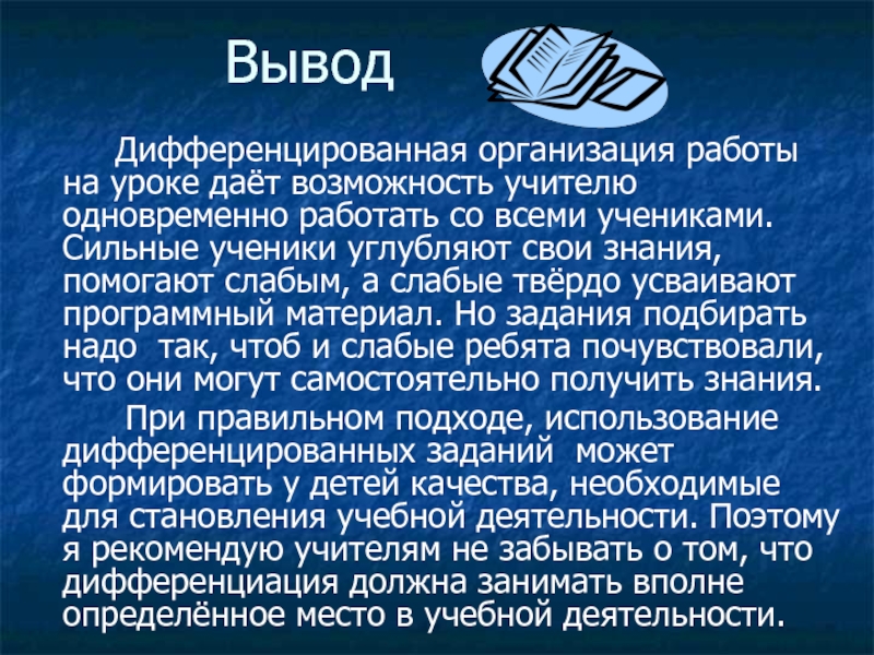 При правильном подходе, использование дифференцированных заданий может формировать у детей качества, необходимые для становления учебной деятельности. Поэтому я рекомендую учителям не забывать о том, что дифференциация должна занимать вполне определённое место в учебной деятельности.