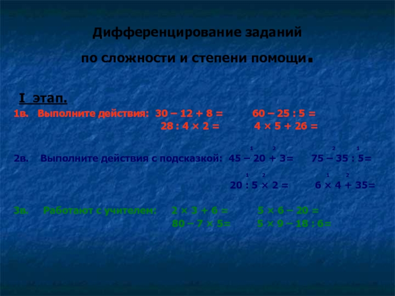 действия: 30 – 12 + 8 = 60 – 25 : 5 =