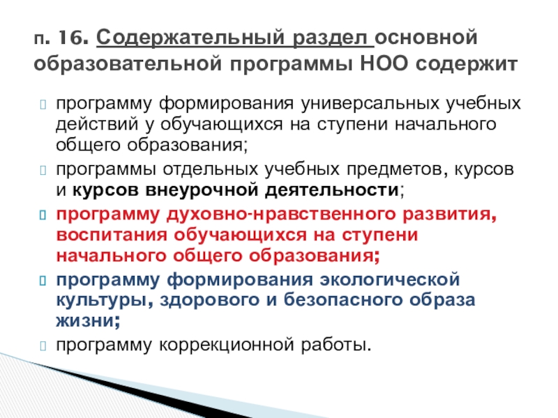 п. 16. Содержательный раздел основной образовательной программы НОО содержит