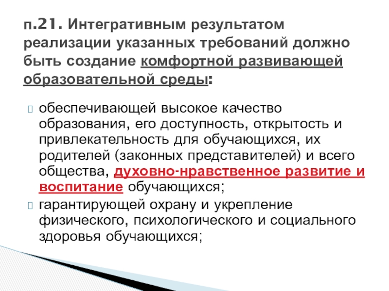 п.21. Интегративным результатом реализации указанных требований должно быть создание комфортной развивающей образовательной среды: