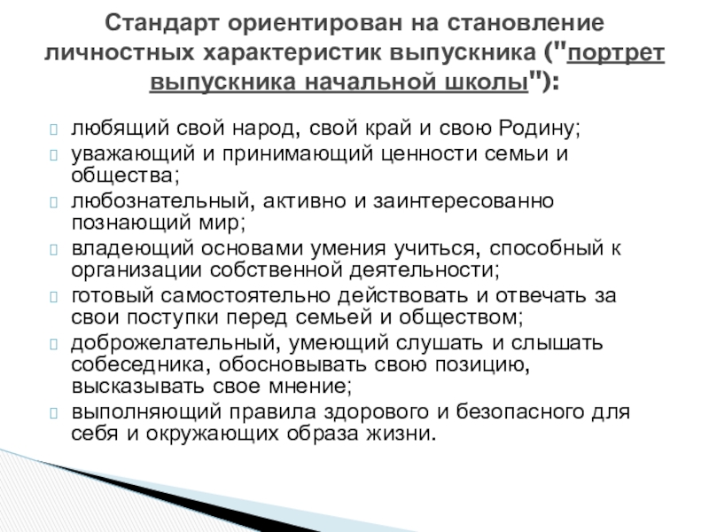 Стандарт ориентирован на становление личностных характеристик выпускника ("портрет выпускника начальной школы"):