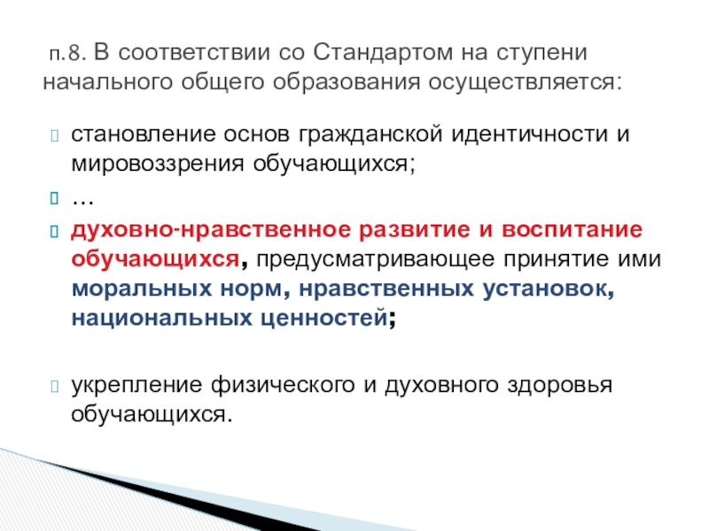 п.8. В соответствии со Стандартом на ступени начального общего образования осуществляется: